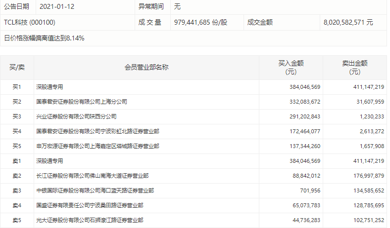 1月12日,TCL科技涨停,报8.6元,股价创下历史新高,全天成交额超80亿元。