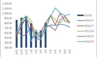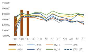 供需两旺也是国内豆粕市场比较形象的概述。自6月到港快速增加以来,下游在需求恢复以及油厂催提影响下,提货量创出历史新高,平衡表预估19/20年度豆粕表观消费同比增速大约在7%左右,而2020年度累积同比增幅达到14%。2020年1-10月,饲料总产量20638万吨,同比增长9.2%,考虑到三季度前整体豆粕现货价格低迷,性价比提升也使各类杂粕被替代,配方调整助力豆粕需求增加。