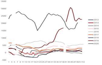 禽料是2020年饲料需求中的最大亮点,而肉禽料已取代猪料成为最大的料种,虽然蛋白价格联动性有待论证,但去年四季度以来猪肉价格的飞速上涨确实给养殖业带来一波大红利,肉禽、蛋禽养殖盈利丰厚激发市场较强的补栏情绪。统计局数据显示,2020年前三季度禽肉产量同比增长6.5%,三季度末家禽存栏67.2亿只,同比增长7.5%。但仅依靠需求替代,高养殖利润其实难以延续,随着产能压力持续增加,年初及三季度国内肉禽养殖分别陷入两轮亏损,第一轮因年初新冠肺炎疫情影响,禽畜需求不利所致;第二轮则发生于2020年三季度,与鸡价、猪价开启持续下跌模式有较大关系。从10-11月国内饲料消费数据以及豆粕提货走势来看,需求端确实出现较大回撤,一定程度反应养殖端情绪减弱。而蛋禽方面,前期蛋价持续下跌以及老鸡淘汰提前也导致市场对产能端有所担忧。不过总体来看,11月以来,鸡苗价格整体呈现快速拉涨,反应产业补栏情绪开始逐步增加,并且国内在高存栏以及祖代产能较高的背景下,禽料也无需太过悲观。