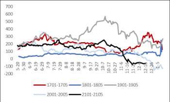 受国内现货压力加大影响,近期盘面近远月价差均无一例外出现大幅下跌,M15价差更是提前走出交割逻辑。而就2021年总供需状况看,高结转库存已成为预期内情况,长期的高榨利可能意味着需求增速远不及供应压力的增加,虽然后续天气炒作、到港节奏、开机率的变化可能带来短期结构性行情,但中长期来看基差及盘面月差仍然缺乏太大亮点。