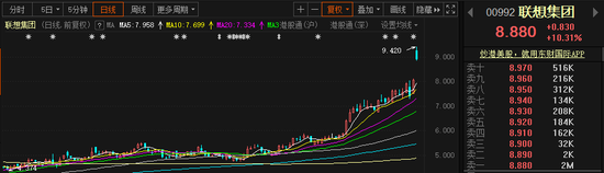 一般而言,企业回A上市往往有利于进一步拓宽公司的融资渠道,也有助于提升估值中枢。今日港股联想集团股价跳空高开,早盘一度涨超14%,后收于8.83元,录得涨幅9.6%。近两个交易日内,联想集团股价涨幅已近20%,市值破千亿港元。