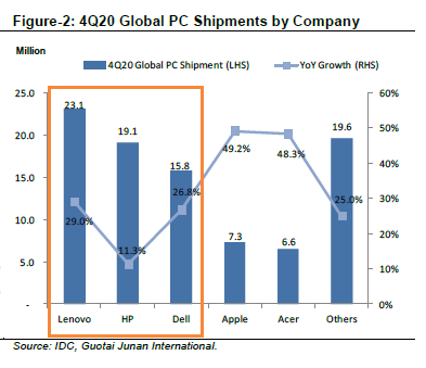 经历了浑水做空报告风波后,自2020年3月开始股价稳步打开上升通道的联想集团在过去的三个季度中还受益于云端业务需求带来的IDC业务短期增长,光大证券认为中长期看,该项业务受益竞争力持续增强。但据其最新财报,个人电脑和智能设备业务仍占据集团总营收的79%。标普在2020年给予其“BBB-”评级时,也曾称原因是联想的业务高度集中于成熟的个人电脑领域、较低(但有所改善)的利润率。