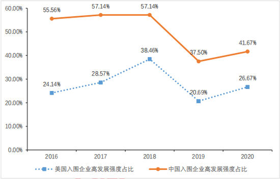 我国上榜制造业企业发展强度波动上升,但仍低于美国行业发展强度。自2016年以来,我国上榜制造业中、高发展强度企业占比均呈波动上升趋势,其中高发展强度企业占比基本在9.44%左右,中发展强度企业占比基本在30.41%左右。自2016年以来,美国上榜制造业中、高发展强度企业占比均呈波动下降趋势,其中高发展强度企业占比基本在18.10%左右,中发展强度企业占比基本在46.88%左右。总体来看,美国制造业入围企业高发展强度占比约是相应我国企业的1.9倍,中发展强度占比约是相应我国企业的2.6倍。