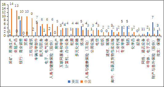 可以看出,我国上榜企业集中在金融、石化冶金等传统领域,新兴领域企业较少。特别是在计算机软件、信息技术服务、医疗等技术密集型高端新兴领域,均有美国企业上榜,我国则空白。