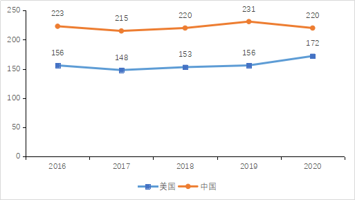 总体来看,中美信息技术服务业入围企业数量均较少,美国信息技术服务业入围企业数量年均多于我国相应企业数量约20家,2020年中美相关企业数量差距缩小至8家。