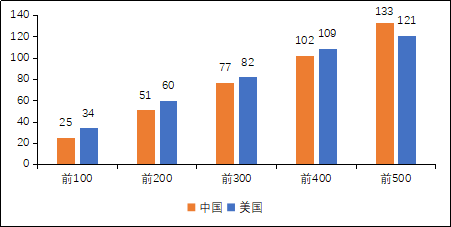 2019年,我国上榜企业数量达到129家,历史上首次超过美国(121家)。即使不计算台湾地区企业,中国大陆企业(包括香港企业)也达到119家。