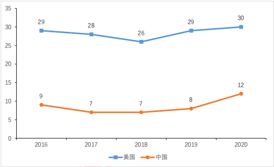 可以看出,近5年来中美信息技术服务业发展走势基本平稳,美国信息技术服务业入围企业数量常年稳定在28家左右,我国相应企业至2020年才突破10家,就信息技术服务业规模方面中美之间存在一定的差距,我国仍需加大对其技术创新投入,持续推动新生业态的发展壮大。
