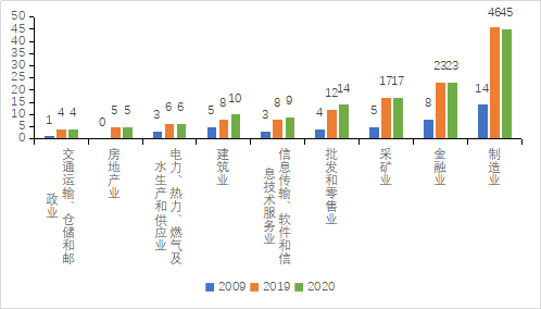 对比2009年我国上榜企业行业分布发现,11年间,9大行业上榜企业数量均实现成倍增长,其中制造业、金融业、零售和批发业的企业数量增幅均在3倍以上。