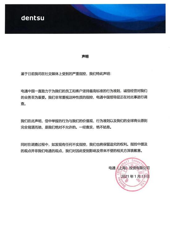 对于这封举报信,电通集团中国企业传播平台“电通dentsu”微信公众号于1月13日深夜发表声明称,“电通中国领导层正在对此事进行调查。信中举报的行为与我们的价值观、行为准则以及我们的全球商业原则完全背道而驰,是我们绝对不允许的。一经查实,绝不姑息。”
