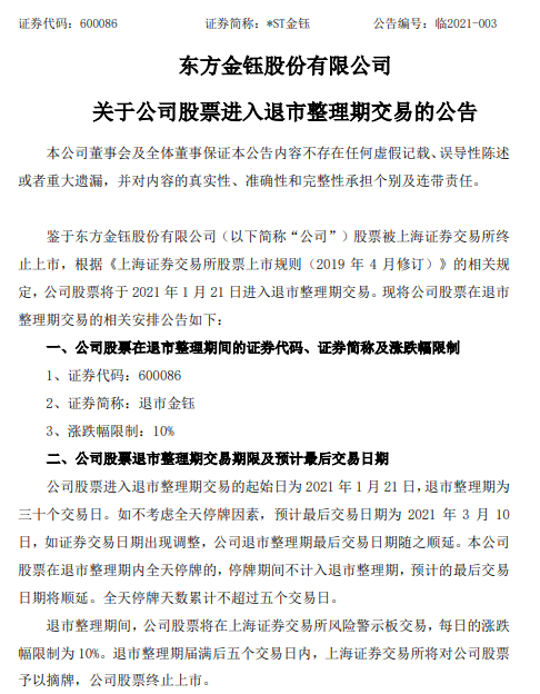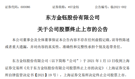 2021年1月13日晚间,上市公司*ST金钰连发两条公告,宣布上交所做出终止上市的决定。