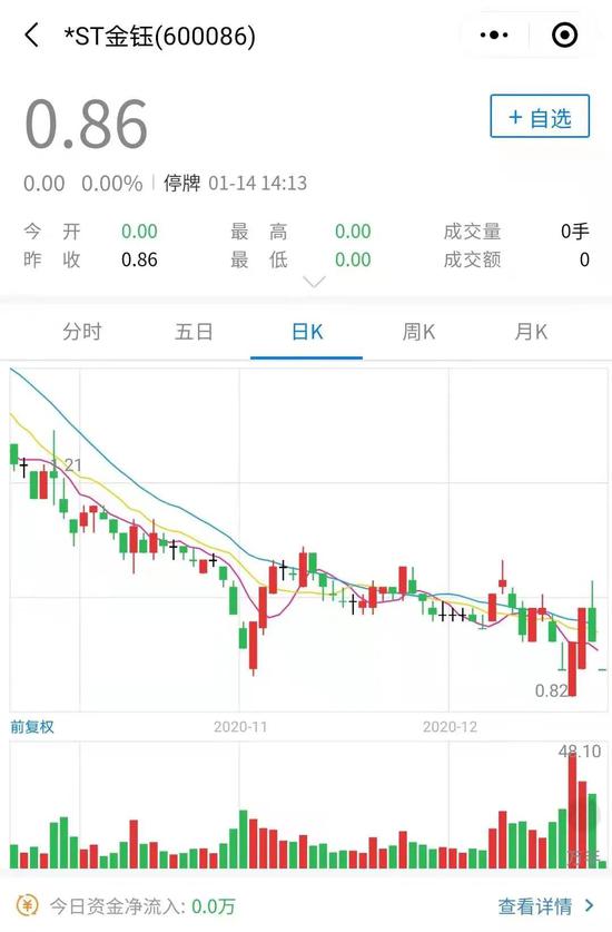 在2020年12月22日,*ST金钰以0.86元/股收盘,并于次日起停牌至今。