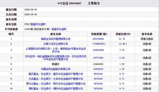 截至2020年9月30日,*ST金钰仍有5,7617户股东,户均持股2.34万股。