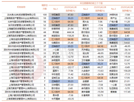 除了迈瑞医疗以外,医疗器械类公司比如新产业、九安医疗、冠昊生物、爱美客等在2020年四季度以来,也受到多家严选私募机构重点关注,同属医药板块的一心堂、美年健康、华东医药等,也是机构关注度较高的公司。