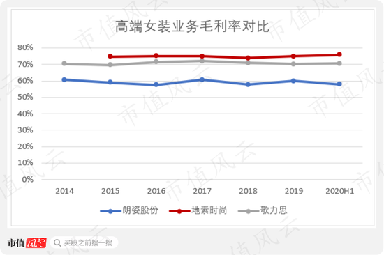 与同行业的中高端女装地素时尚(603587.SH)、歌力思(603808.SH)相比,朗姿股份的女装业务毛利率比较稳定但偏低。(下载市值风云APP,搜索“地素时尚”、“歌力思”获得相关研报)