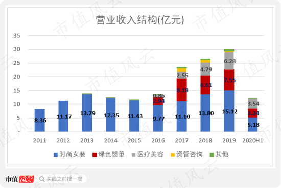到了2019年,朗姿股份约五成的收入和过半的毛利仍来自时尚女装业务,其余四成毛利则来自绿色婴童业务和医疗美容业务。