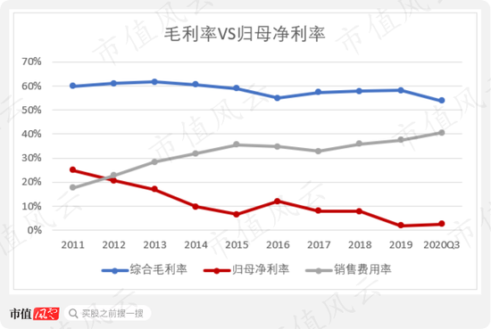 总体上,公司的综合毛利率呈下降趋势,从上市初期的60%左右降至2020年前三季度的53.85%。