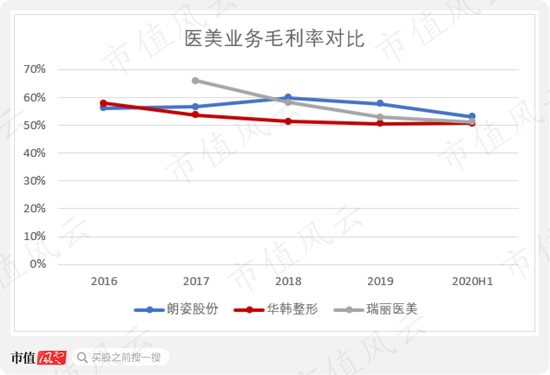 与同行业上市公司相比,朗姿股份的医美业务毛利率偏高。2020年上半年,几家整形美容公司的毛利率趋同,大约在50%左右。