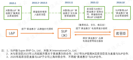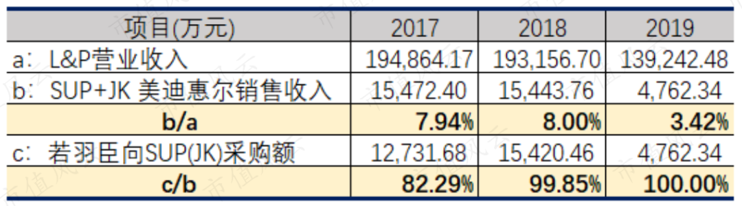 各项交易的时间节点显示,尽管L&P与JK关于“美迪惠尔”的合作历史最早可追溯至2014年12月,但朗姿股份先后参股若羽臣和L&P期间,若羽臣、JK以及L&P三方之间的交易规模扩大是不争的事实。