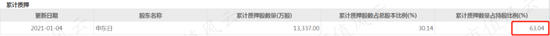 截至2021年1月4日,申老板最新的累计质押数量占持股比例为63.04%,质押股份占上市公司总股本的30.14%。
