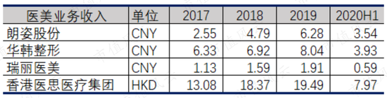 虽然朗姿股份已被列为国内大型医美机构,但与华韩整形(430335.OC)、香港医思医疗集团(02138.HK)相比,朗姿股份的医美业务整体业绩与业内“前辈”仍有差距。