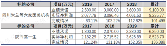 其他医美并购标的的业绩承诺实际完成情况上,四川米兰等六家医美机构最终基本是擦线完成,陕西高一生完成情况明显更好。
