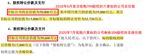 2020年7月,朗姿股份再次收购以上六家医美标的剩余30%股份。此时,六家医美标的整体估值从上次收购的5亿元调整为5.96亿元,上浮19.2%。这一次收购的交易价格同样也没有评估报告提供定价依据。