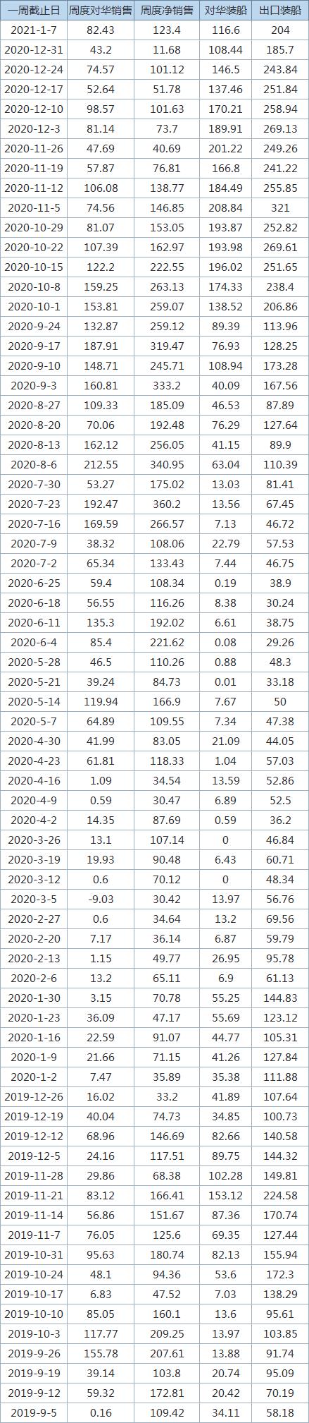 以下为2019/20年度以来USDA大豆周度对华出口销售数据统计(单位:万吨):