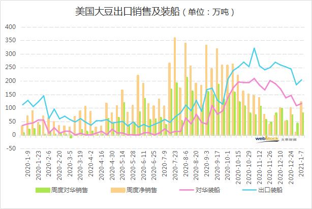 当周美国对中国装运116.6万吨大豆,略高于前一周的108.4万吨。截止到2020年1月7日,2020/21年度美国对中国大陆地区大豆出口装船量为2843万吨,几乎为去年同期984万吨的三倍。