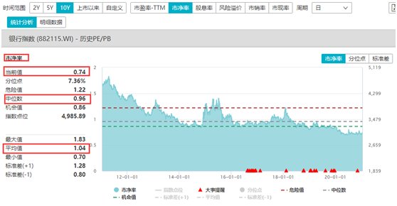 目前,相当数量的A股银行股仍处于破净状态。截至2021年1月14日,Wind银行指数市净率为0.74倍,明显低于最近十年的平均值和中位数。数据显示,最近十年Wind银行指数市盈率平均值为1.04倍,中位数为0.96倍。