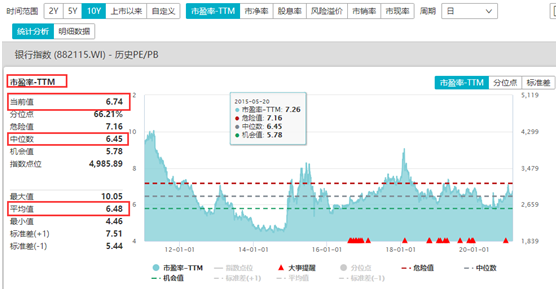 最近十年Wind银行指数市盈率(TTM)平均值为6.48倍,中位数为6.45倍。