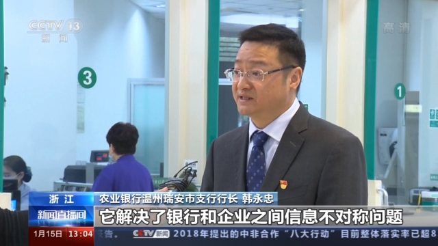 农业银行温州瑞安市支行行长 韩永忠:它解决了银行和企业之间信息不对称问题,可以大大提高我们银行的服务效率。