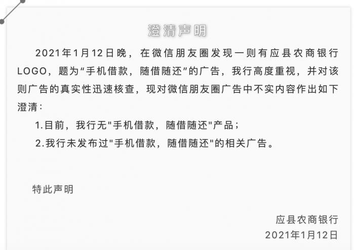对于上述公司信息被“错用”的问题,1月12日晚间,应县农商银行也紧急发布《澄清声明》表示,对上述微信朋友圈中应县农商银行“手机借款,随借随还”的广告,迅速进行真实性核查,并澄清:该行无”手机借款,随借随还”产品;该行未发布过“手机借款,随借随还”的相关广告。