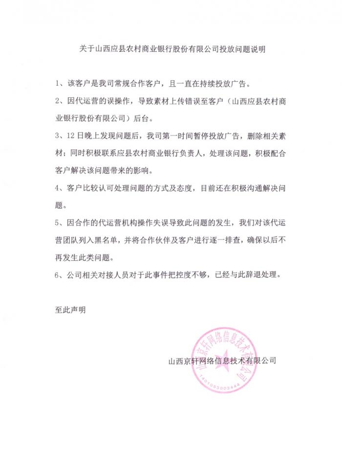 山西京轩也发布声明称,应县农商银行为其常规合作客户,且一直在持续投放广告;因代运营的误操作,导致素材上传错误至应县农商银行后台;应县农商银行比较认可处理问题的方式及态度,目前还在积极沟通解决问题。