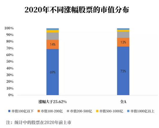 2020年前上市的3744只A股公司中,年初市值在100亿以下的公司占比73%;2020年战胜万得全A的1051只股票中,100亿市值以下的公司占比69%,并没有显著差别。无论是大盘股和小盘股,都有好的赚钱机会,也都有表现不佳的个股。