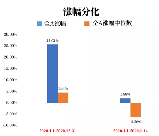 市场上有一种观点认为资金在抱团大盘股,使得大盘股收益明显。从2020年和2021年的股票表现来看,股票涨幅分化比较明显,2020年全A加权涨幅23.4%,而涨幅中位数仅在4.44%;2021年前2周全A加权涨幅2.04%,涨幅中位数为下跌6.26%。