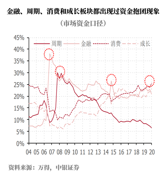 自2004年,在不同的经济发展阶段,金融、周期、消费和成长等各种风格都出现过明显的资金抱团现象,相关行业和个股在抱团的鼎盛期都产生了明显的超额收益,在全市场的流通市值占比第一。