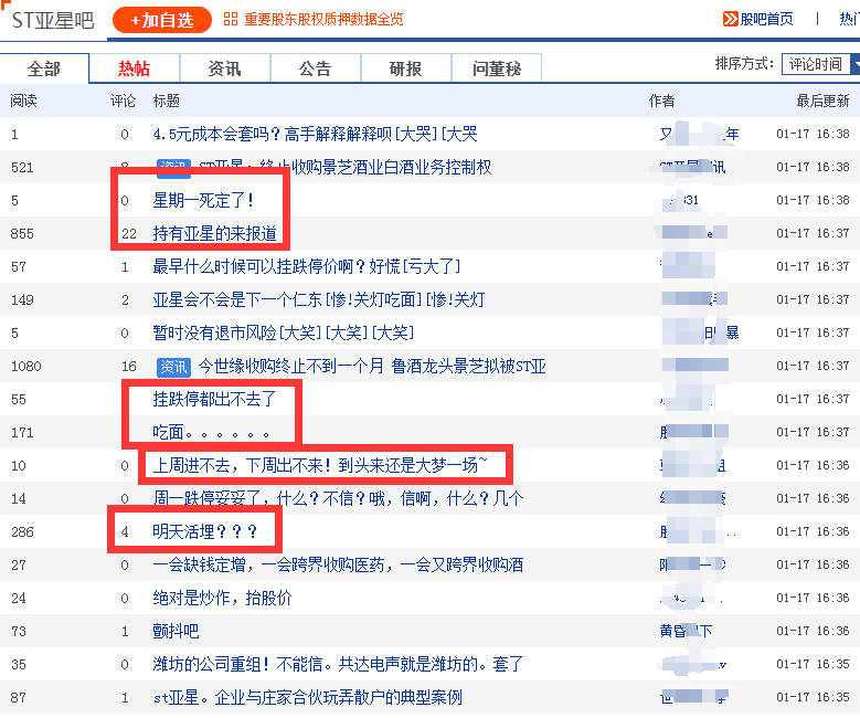 针对终止重组的利空消息,ST亚星股吧热度迅速飙升,网友们瞬间炸锅了。有网友称,“挂跌停都出不去了”,“几个跌停?”,有人怒称,“吃相太难看”,“星期一死定了!”、“最早什么时候可以挂跌停价啊?好慌!”