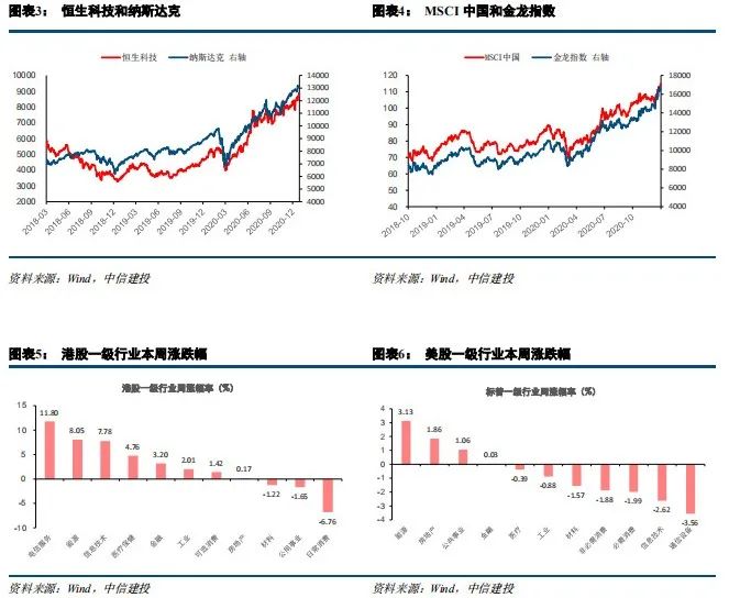 港股领涨全球权益市场,南下资金流入创历史新高。市场层面,本周恒生指数、国企指数和恒生科技指数分别上涨2.50%、3.33%和1.68%,港股领涨全球权益市场。本周港股万得二级行业多数上涨,其中电信服务(11.80%)和软件服务(11.19%)涨幅最大。估值层面,本周恒生指数PE上涨0.71至16.44倍,高于历史均值加一倍标准差上限,当前制药、生物科技与生命科学、耐用消费品与服装等行业的估值处于历史相对高位,而媒体、消费者服务等行业估值处于历史相对低位。近两周南下资金分别流入655亿港元和702亿港元,连创历史新高,远高于去年疫情全球肆虐时期水平。