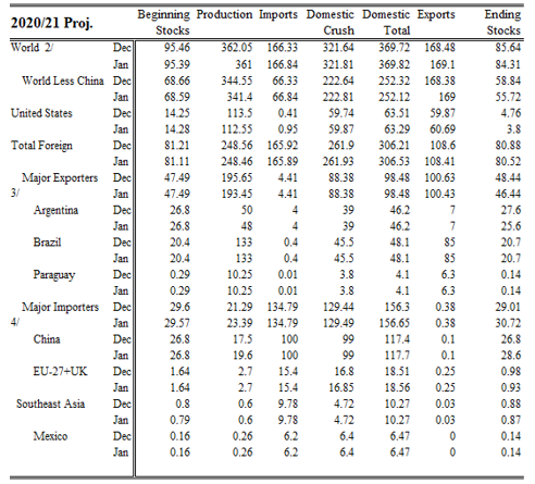 具体来看,USDA发布的1月供需报告中,美豆单产从50.7蒲/英亩下降至50.2蒲/英亩,产量由41.70亿蒲下降至41.35亿蒲,主要原因是明尼苏达、爱荷华和堪萨斯州的产量下降。压榨由21.95亿蒲上升至22亿蒲,出口由22亿蒲上升至22.3亿蒲,其他各项略有调动,最终期末库存有1.75亿蒲下降至1.4亿蒲,达到2014年以来的新低。
