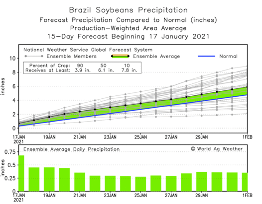 从南美大豆的生长情况来看,巴西地区降水尚可,阿根廷地区近期虽然有零星降水,但前期干燥的天气带来的损失恐难弥补。巴西帕拉纳州农村经济部表示,截至1月11日当周,大豆优良率为82%,比一周前提高3%。大豆状况评级一般的比例为15%,低于一周前的17%。差劣率维持不变,仍为3%。目前帕拉纳州大豆进入扬花期的比例为43%,成熟比例为2%。目前大豆收获进度不到播种面积的1%。