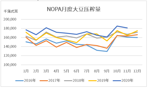 (2)美豆压榨低于预期 美国全国油籽加工行业协会(NOPA)11月15日,美国全国油籽加工行业协会(NOPA发布的压榨数据显示,12月份NOPA会员企业加工大豆1.832亿蒲式耳,低于市场预期的1.85175亿蒲式耳。