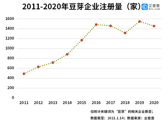 2011年以来的十年之间,豆芽相关企业注册量总体上呈增长趋势。企查查数据显示,2011年共注册487家。2019年的豆芽企业注册量来到了十年来的最高点,共1544家,同比增长18%,2020年共注册1452家,同比减少6%。