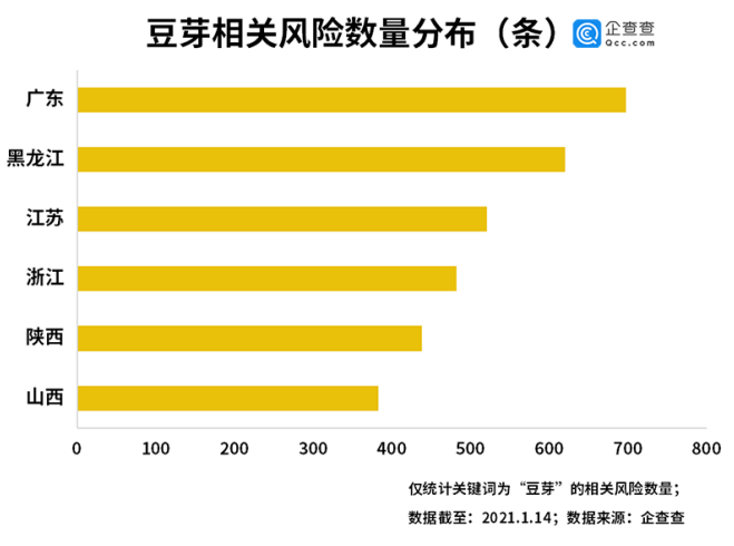 从相关企业的经营风险来看,企查查数据显示,广东省的豆芽相关风险数量最多,共697条。黑龙江占据第二,共620条。江苏省则以520条相关风险排在第三位。