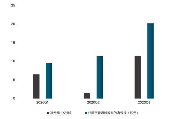 进入2020年以来,其亏损并未呈现出明显的缓和。《投资时报》研究员留意到,2020年第一季度至第三季度,其各季度单季净亏损分别为6.5亿元、1.46亿元、11.49亿元,且各季度归属于普通股股东的净亏损数额更大,分别为9.5亿元、11.42亿元、20.23亿元。