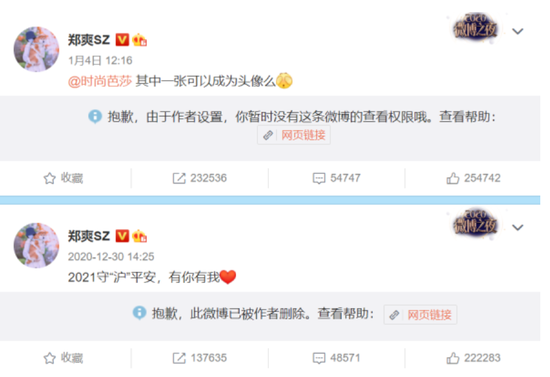 目前,《时尚芭莎》杂志官方微博率先将郑爽相关内容设置为不可见,此前郑爽转发过该微博。