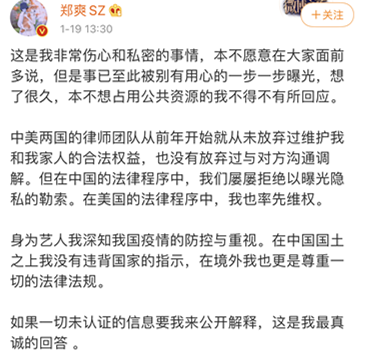 19日午间,郑爽发微博称:自己在中国国土之上没有违背法律,在境外也是,并强调自己遭到勒索以曝光隐私的勒索。