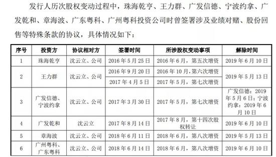 2019年5月至6月前后,珠海乾亨、王力群、广发信德、宁波约拿、广州粤科、广东粤科、章海波均与九恒条码和沈云立签订补充协议,终止投资协议之补充协议中业绩对赌、股份回售等特殊条款,同时未定要求沈云立和公司承担任何法律责任。