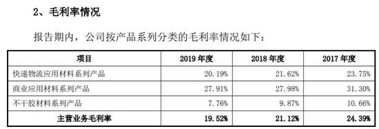 另外,九恒条码营业业务毛利率也是逐年下滑。报告期内,九恒条码主营业务的毛利率分别为24.39%、21.12%和19.52%。其中,快递运单的毛利率下滑更为严重,2017至2019年分别为31.81%、21.37%和9.54%。