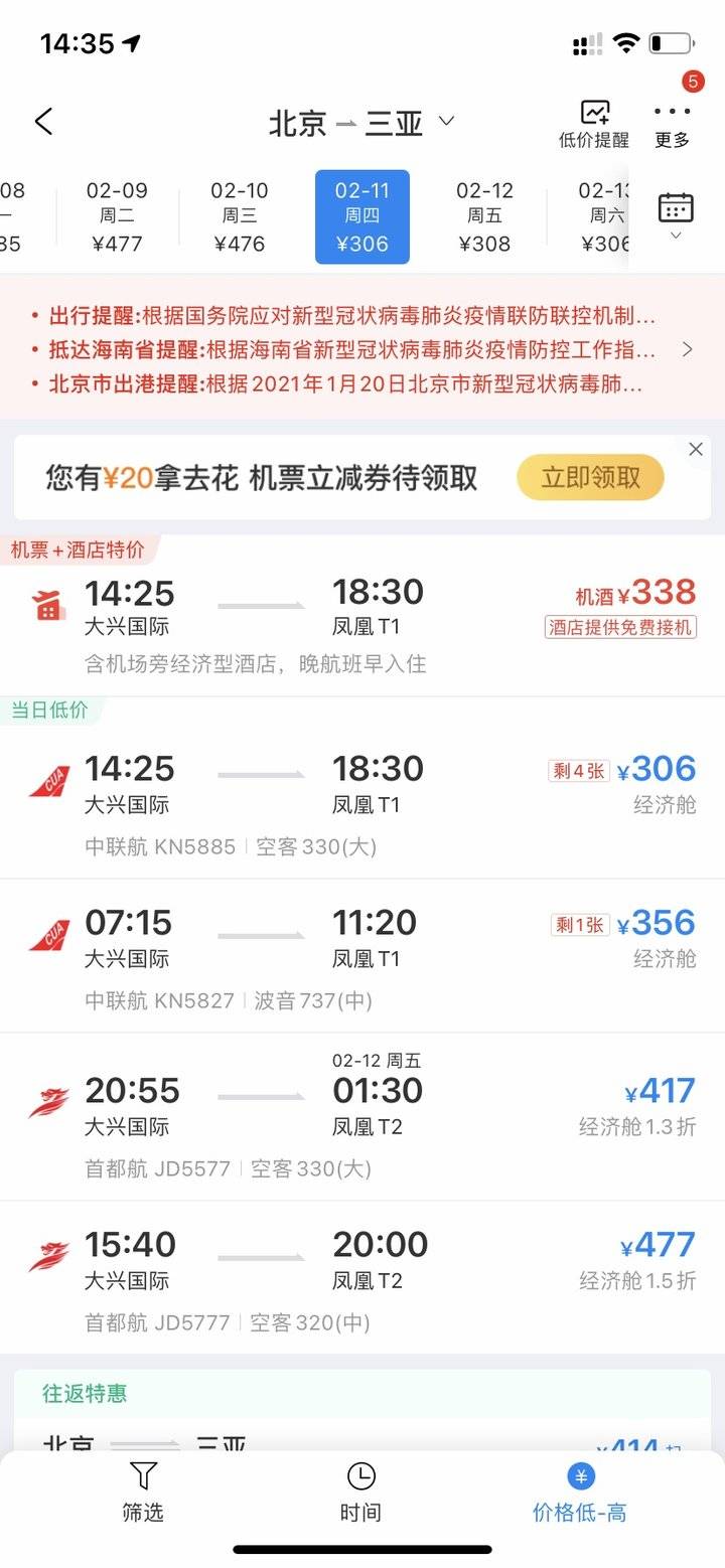 比如,北京至三亚航线,2月10日(腊月二十九)最低仅需476元,2-3折机票仍有较多选择;2月11日(大年三十)最低仅需306元,接近1折,最高票价1810元,折扣打到了5.5折。
