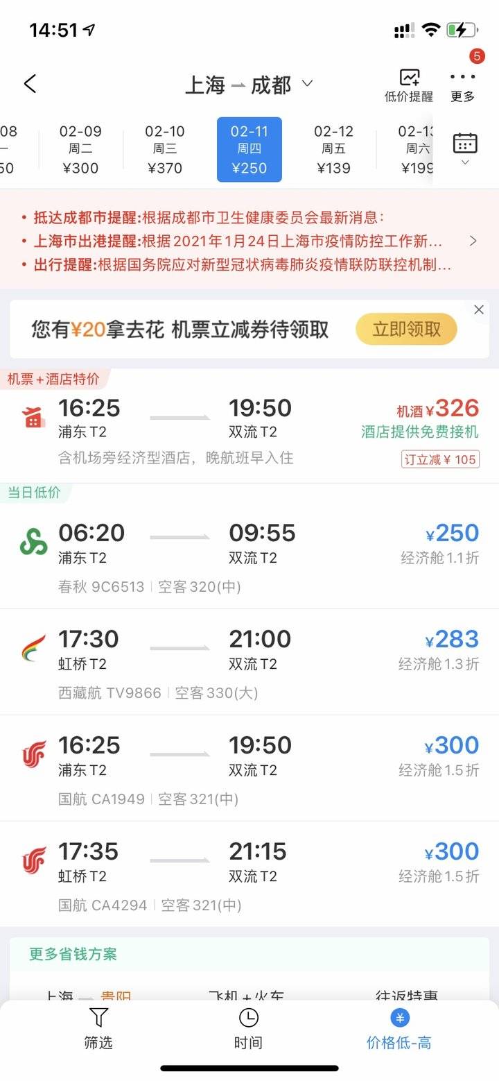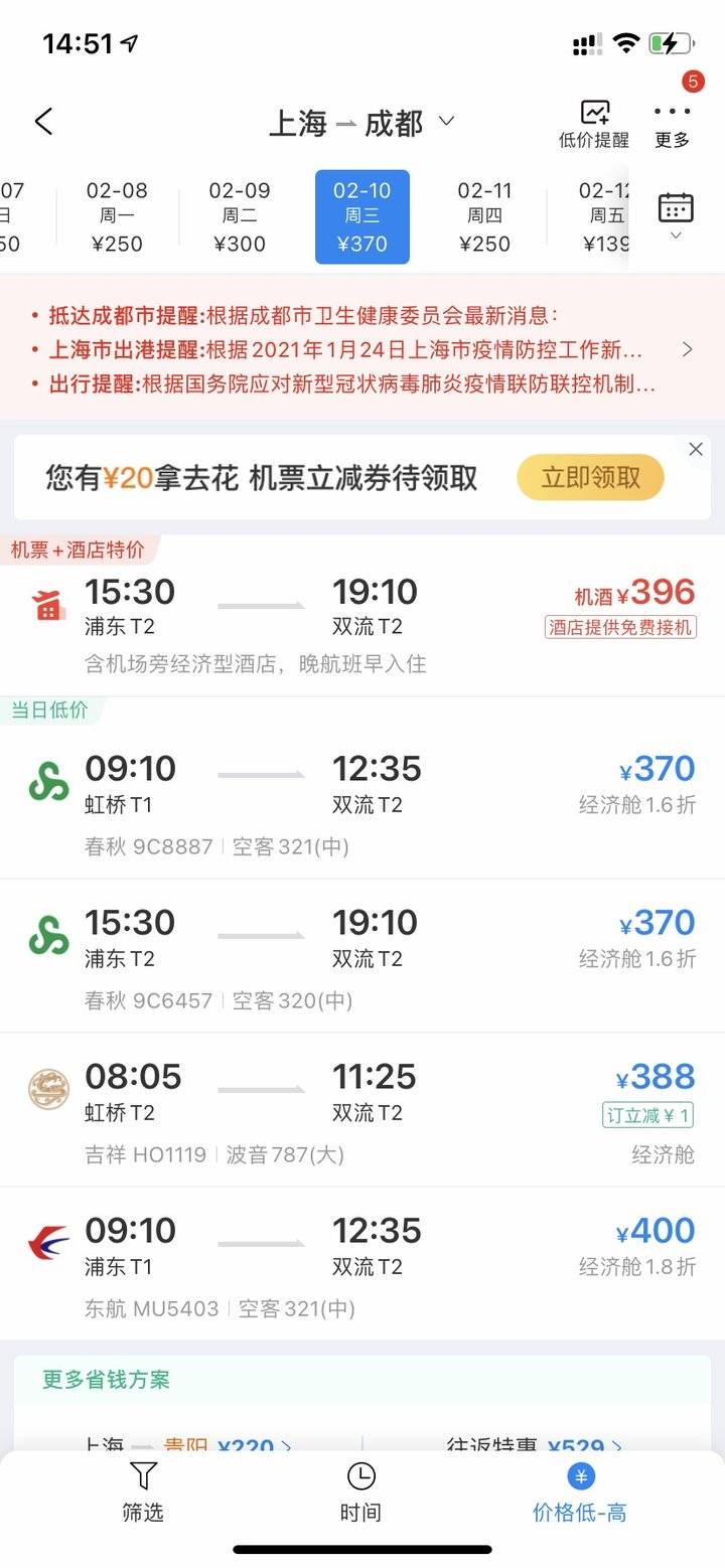 上海至成都航线,2月10日(腊月二十九)最低仅需370元,1-2折机票仍有较多选择;2月11日(大年三十)最低仅需250元,折扣1.1折,最高6.4折1490元。